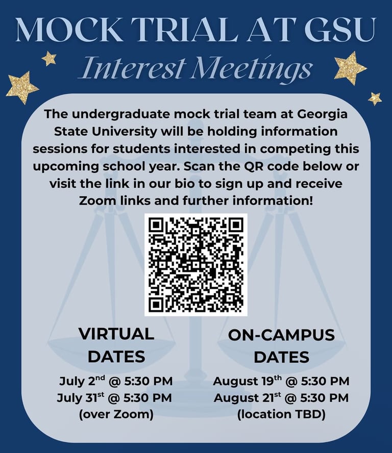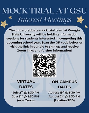 Check out our FAQ page to see if we've already answered your question! And you still have any questions email us at mocktrialatgsu@gmail.com, and follow us @mocktrialatgsu on Instagram for updates!